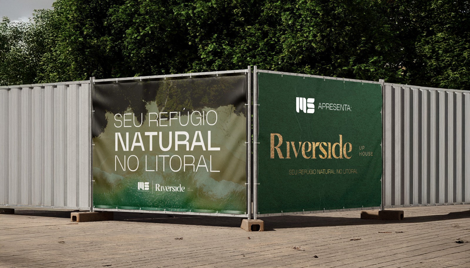 Algumas letras foram redesenhadas de forma exclusiva, como o “r” e o “s”, que recebem detalhes orgânicos em suas extremidades. Esses elementos remetem diretamente ao entorno do empreendimento, marcado pela proximidade com o rio e pela presença constante da mata, reforçando a conexão natural que dá origem ao nome Riverside.